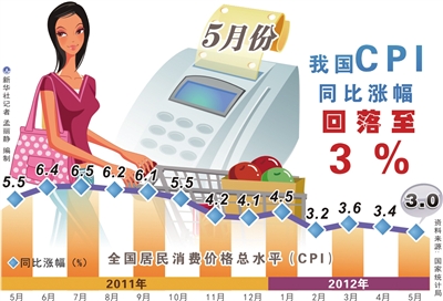 数据显示,5月份全国居民消费价格总水平(CPI)同比上涨3.0%,涨幅比上月回落0.4个百分点;环比下降0.3%,比上月降幅扩大0.2个百分点。国务院参事室特约研究员姚景源指出,CPI同比涨幅创下22个月来新低,表明我国物价上行压力在逐步减小,物价总水平基本保持稳定。