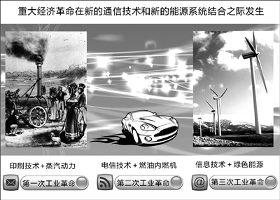 如今,我们正处在信息技术与能源体系相融合的时代。互联网信息技术与可再生能源的出现让我们迎来了第三次工业革命。在21世纪到来之际,数以百万计的人们将实现在家庭、办公区域以及工厂中自助生产绿色能源的梦想。此外,正如人们在互联网上可以任意创建属于个人的信息并分享一样,任何一个能源生产者都能够将所生产的能源通过一种外部网格式的智能型分布式电力系统与他人分享。