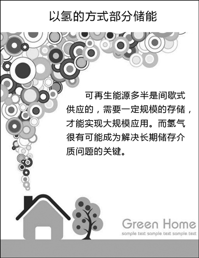 它的工作原理是这样的:当阳光照射到太阳能电池板上时,会产生电能,其中大部分用于给建筑物供电。如果电能出现了盈余,便可以用做储备能源,将氢气从水中分解出来。如果太阳光不好,氢气便可以再提取出来用于发电。