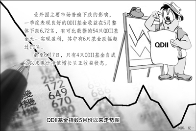数据显示,有可比数据的54只QDII基金中,无1只在5月实现净值的正增长,除了投资于全球债券市场的富国全球在5月净值损失0.72%以外,其余QDII基金的净值损失都超过3%。