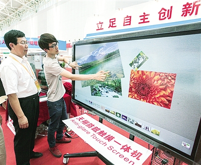 6月11日,在天津举行的第二届高校创新成果转化展洽会上,工作人员在展示具有自主知识产权的防眩目触摸一体机。13所高校的18项科技转化成果成功签约,签约项目金额达2385.5万元。 李 想摄(新华社发)