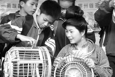 日前,贵州省丹寨县非物质文化遗产展示厅内,中学生在向非物质文化遗产传承人学习鸟笼编织技艺。 本报记者 王新伟 通讯员 黄晓海摄影报道