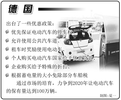 鉴于电动汽车的续驶能力还没有完全过关,德国目前将电动汽车定位为城市内的交通工具。在城市普及电动车,花钱少、见效快。比如,建设基础设施充电站和充电桩,包括在停车场或公寓的地下车库安装充电装置等,很快就可形成网络,无需担心找不到充电装置。为了培育市场,德国还出台了一些优惠政策,如优先保证电动汽车的停车权、允许使用公共汽车道、租车时奖励使用电动车、个人购买电动汽车国家给予优惠贷款、企业购买给予特殊的折扣、根据蓄电量的大小免除部分车船税等。旨在通过市场的培育,力争到2020年让电动汽车的保有量达到100万辆。