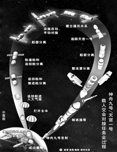 神九腾空在即,天宫一号与神舟九号载人交会对接任务的发射场系统总指挥崔吉俊表示,此次载人交会对接任务将实现4个首次,分别是航天员首次实施手控交会对接、航天员首次进入天宫一号驻留,首次有女航天员飞行,首次进行多天载人飞行。其中神九航天员将首次实施手控神舟九号与天宫一号的交会对接成为人们最为关注的热点之一。