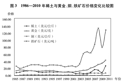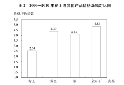 ——价格严重背离价值。一段时期以来,稀土价格没有真实反映其价值,长期低迷,资源的稀缺性没有得到合理体现,生态环境损失没有得到合理补偿。2010年下半年以来,虽然稀土产品价格逐步回归,但涨幅远低于黄金、铜、铁矿石等原材料产品。2000年至2010年,稀土价格上涨2.5倍,而黄金、铜、铁矿石价格同期则分别上涨4.4、4.1、4.8倍。