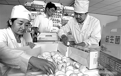 山东东营市河口街道民生专业食用菌合作社员工正在包装双孢菇。该合作社大力发展生态农业,形成了绿色无公害蔬菜产业链,带动周边80多个农户共同致富,年产值达5000余万元。 本报记者 李树贵摄