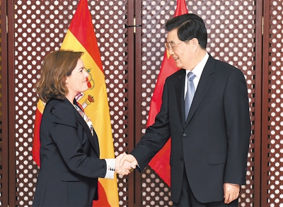 本报西班牙特内里费岛6月20日电 记者王宝锟报道:国家主席胡锦涛20日在西班牙特内里费岛会见了西班牙副首相萨恩斯·德圣玛丽亚。
