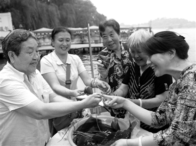 6月19日,北京北海公园,社区居民在荷花船上进行包粽子比赛。端午节来临之际,北京各大公园推出一系列端午文化活动,吸引游客及社区居民参与。 本报记者 赵 晶摄