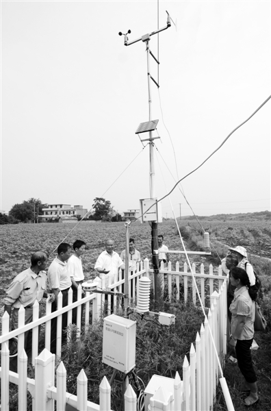 江西湖口县武山镇五里村气象信息员陈淼洋(左四)在给当地村民讲解气象自动监测设备。 近年来,江西在全省范围内建立由村委会干部、防汛员、农技员、报灾员、地质灾害群测群防员、农业科技示范户组成的气象信息员队伍,成为气象为农服务的重要力量。目前,江西气象信息员总人数达1.97万人,服务范围涵盖省内各乡镇和行政村。 新华社记者 周 科摄