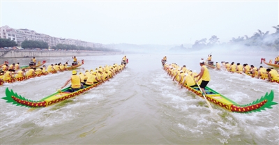 6月22日,参加广西百色端午龙舟大赛的龙舟队在右江河上划桨竞渡。6月23日端午节前夕,全国多地举办赛龙舟民俗活动,欢庆节日到来。