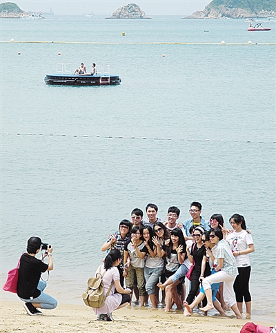 左图 6月初,游客在香港浅水湾海滩边合影留念。 本报记者 连 俊摄