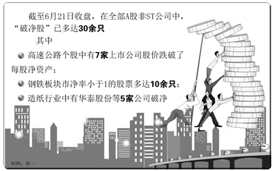近期股指在2300点附近徘徊,个股股价也萎靡不振、频频走低,跌破每股净资产的“破净”现象屡屡出现。据初步统计,截至6月21日收盘,在全部A股非ST公司中,“破净股”已多达30余只,其中钢铁板块和交通运输板块股票多达20余只,占“破净股”总数近7成,银行股也占据2个席位。