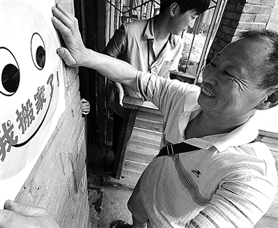 安徽合肥的棚户区改造进行顺利,图为三里街木器厂北区棚户区居民在动迁的家门口贴上“搬迁笑脸”。