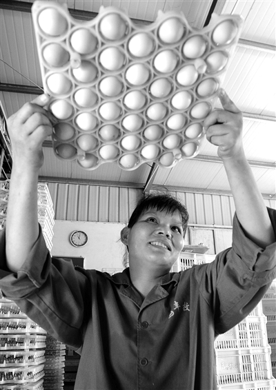 6月26日,广西灵山县竹塘村农民周业兰在按标准要求挑选出口外销的鸡蛋。