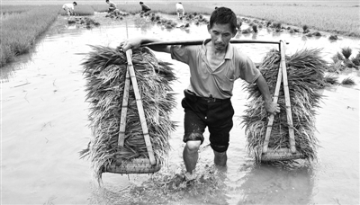 上图 江西婺源县太白镇潘村农民挑着秧苗准备插秧。