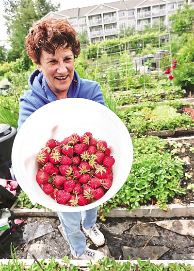 6月25日,在加拿大温哥华市区的社区花园内,一名市民展示她的收成。