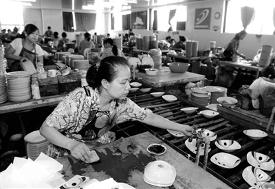 6月28日,广西浦北县小江镇的留守妇女在陶瓷厂车间生产瓷碗。广西浦北县小江镇是一个传统陶瓷产业镇,已有1300多年瓷器生产历史。2011年,该镇制瓷产业实现产值4000多万元,90%的日用瓷器远销欧洲、东南亚,1000多名山区留守妇女就地成为产业工人。 新华社记者 周 华摄