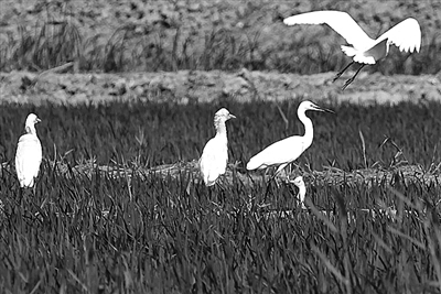 山东即墨市金口镇的稻田绿意盎然,水稻长势喜人。大批白鹭纷纷来此栖息觅食,田园充满诗情画意。