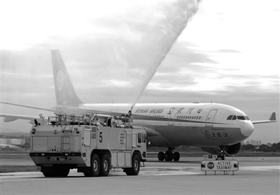 6月22日,四川航空公司3U8579航班抵达加拿大温哥华国际机场,机场方面以喷水礼表示欢迎。
