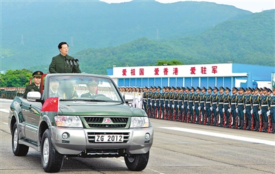16时许,胡锦涛抵达石岗军营。阅兵场上,3000多名驻军官兵排列成15个方队,军姿威武、装备整齐、士气高昂,接受胡主席的检阅。胡锦涛乘阅兵车,在雄壮的阅兵曲中检阅了部队。“同志们好!”“同志们辛苦了!”胡锦涛用洪亮的声音向受阅官兵表示诚挚问候。“为人民服务!”官兵们以整齐有力的回答感谢胡主席的亲切关怀。
