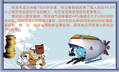 “蛟龙号成功突破7000米深度,标志着我国具备了载人到达全球99.8%以上海洋深处进行作业的能力,对于我国开发利用深海的资源有着重要的意义。”“蛟龙”号总设计师徐芑南告诉记者。