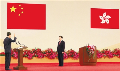 香港特别行政区第四任行政长官梁振英及特别行政区政府主要官员等宣誓就职 胡锦涛强调,中央政府实行“一国两制”、“港人治港”、高度自治方针将毫不动摇,全力支持香港特别行政区行政长官和政府依法施政将毫不动摇,同香港各界人士一道维护和促进香港长期繁荣稳定将毫不动摇。在中央政府、香港特别行政区政府和社会各界人士共同努力下,“一国两制”实践一定会越来越丰富,香港与祖国内地共同繁荣发展的道路一定会越走越宽广