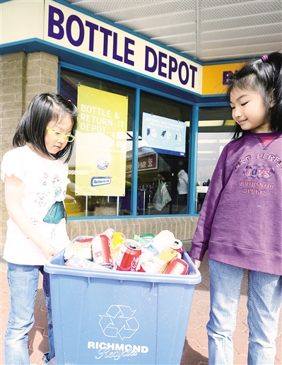 在加拿大大温哥华地区,垃圾分类及回收的环保理念已深入人心。为了配合市政府2015年前达成70%的固体废物可循环再用的目标,居民在日常生活中都会将垃圾中的纸类、玻璃、塑胶、厨余和修剪后的花草分类以便回收。图为在加拿大温哥华的里士满,孩子们将饮料容器带往回收站。 新华社发