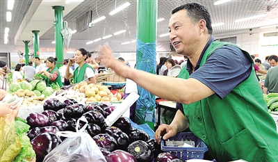 6月30日,北京丰台区开阳里社区便民菜市场蔬菜摊主、共产党员孙正付正在热情为居民服务。