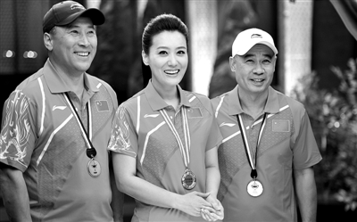 为给即将出征的中国奥运健儿鼓劲加油,谭晶与李宁(右)、李永波合作录制了奥运公益歌曲《心的金牌》。