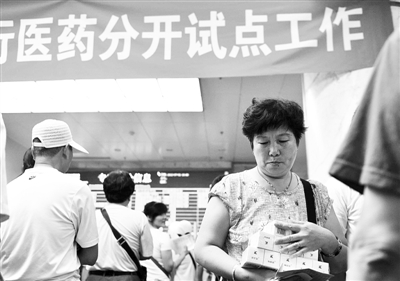 7月2日,在北京友谊医院一楼大厅,一位女士手拿药品从医药分开的横幅下走过。从7月1日起,北京市在友谊医院试点医药分开,取消挂号费、诊疗费和15%的药品加成,实行医事服务费制度。其中,取消药品加成将直接减少患者所付药品费用,并缓解“大处方”现象。7月2日是实施“医药分离”后的第一个工作日。 新华社记者 李 文摄