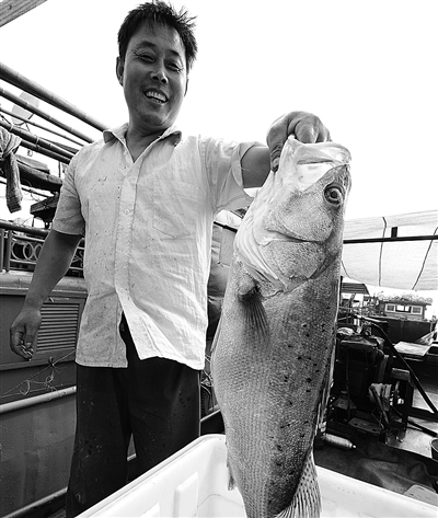 左图 7月1日,江苏省太仓市渔民张本来展示刚刚从长江捕捞的一条6斤多重的鲈鱼。
