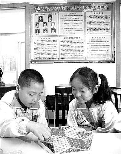 2007年,北街社区依托服务中心成立了社区校外留守儿童活动中心,由社区干部、爱心志愿者、社区大学生村官担任活动中心领导机构成员。活动中心建有图书室、阅览室、书画室、健身馆、舞蹈室等儿童活动场所,配备有电脑、电话、电视机和各类少儿图书1000余册,设有羽毛球场、乒乓球台和各类健身器材,象棋、跳棋、军棋、羽毛球拍和乒乓球等文体用品。同为小学三年级四班的薛景文和冯山峻,每天在学校完成作业后,都要到社区活动中心玩耍两个多小时:画画、看书、下跳棋、打羽毛球……
