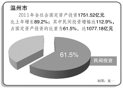 温州市统计局数据显示,2011年全社会固定资产投资1751.52亿元,比上年增长89.2%;其中民间投资增幅达112.9%,占固定资产投资的比重为61.5%。2012年,温州市提出,要完成全社会固定资产投资2280亿元,增长30%以上,其中民间投资占全社会总投资63%以上。