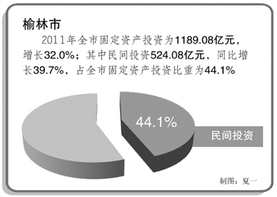 榆林市统计局数据显示,2011年全市固定资产投资为1189.08亿元,增长32.0%;其中民间投资524.08亿元,同比增长39.7%,高于固定资产投资增速7.7个百分点,占全市固定资产投资比重为44.1%,对全市固定资产投资的增长贡献率为51.67%。