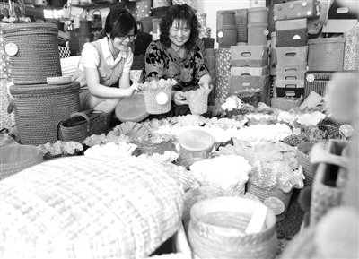 7月3日,客商在山东即墨市刘家庄镇东方草制品合作社选购草编制品。近年来,山东省即墨市刘家庄镇组织当地农民利用玉米皮、庄稼秸秆等原料,进行工艺品加工制作。目前,农民编织的手提袋、水果篮、礼盒、草帽等工艺品远销到欧美、日本、俄罗斯等国家和地区。 梁孝鹏摄(新华社发)