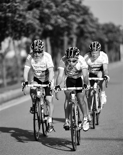 7月2日,台湾前自行车选手张胜凯(后)与父亲张汉章(前左)、儿子张家豪(前右)在福州街道上骑行。当日,现年50岁的台湾前自行车选手张胜凯,带着78岁的父亲张汉章与12岁的儿子张家豪从福州出发前往首站福建宁德,开始祖孙三代骑自行车挑战4500公里“长征”。 新华社发