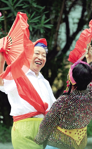图②:兴山县昭君村旅游景区,王作权(左)与老伴为游客表演地花鼓。随着文化旅游的升温,大批民间艺人成为了舞台上的主角。
