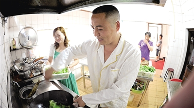 图③:兴山县朝天吼漂流景区,“农家乐”饭店李明(中)夫妇烹调的农家饭备受游客欢迎。在当地,突出土家风格特色的“农家乐”饭店已有50多家。