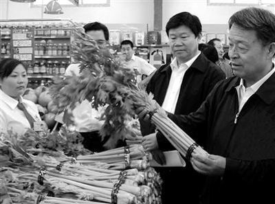 图为杨传堂(右)在山东省潍坊市寒亭区固堤基层社的中联亿家日用品超市调研。