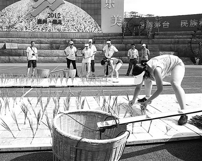 在贵州省第二届农民运动会上,参赛选手正进行插秧比赛。 本报记者 李春霞摄
