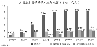 2011年,这三项基本医保已覆盖全国95%的人口,构建起世界上最大的基本医保网,保障水平也在逐步提高。仅就新农合来说,各级财政补助标准达到200元,住院费用政策范围内报销比例提高到70%左右,全年参合农民共报销1710.2亿元,受益13.15亿人次。