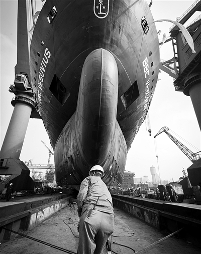 7月10日,一名工作人员在船台上拉闸放小船台最后一艘船下水。