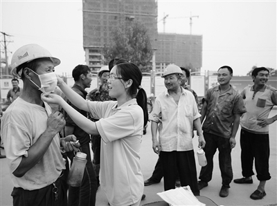 河南新乡医学院暑期社会实践“我是小小创可贴”服务团的实践队员们深入建筑工地,为建筑工人送上免费防尘口罩。 本报记者 王 伟 通讯员 代 娟摄影报道