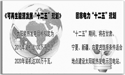 《可再生能源发展“十二五”规划》提出,太阳能热发电目标拟定为2015年装机达100万千瓦,2020年装机达300万千瓦。在国家电力“十二五”规划中,也明确指出“十二五”期间,将在甘肃、宁夏、新疆、内蒙古选择条件适合地点建设太阳能热发电示范电站。《产业结构调整指导目录2011版》在指导目录鼓励类新增的新能源门类中,太阳能光热发电被放在突出位置。