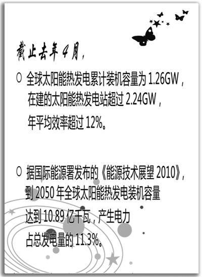 最新数据显示,全球范围的第二次光热发电热潮已悄然来临,万亿产业正在成形。到去年4月,全球太阳能热发电累计装机容量为1.26GW,在建的太阳能热发电站超过2.24GW,年平均效率超过12%。据国际能源署发布的《能源技术展望2010》,到2050年全球太阳能热发电装机容量达到10.89亿千瓦,产生电力占总发电量的11.3%。