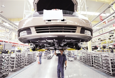 7月19日,吉利汽车浙江宁波生产基地的工人在安装吉利旗下帝豪品牌汽车的底盘配件。据介绍,吉利汽车今年上半年实现销量22.3万辆,同比增长4.2%,达到全年销售46万辆目标的48.2%。 新华社记者 黄宗治摄