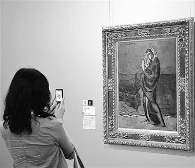 7月18日,在日本箱根宝丽美术馆,一名游客在毕加索的名画《海边的母子》前拍照留念。
