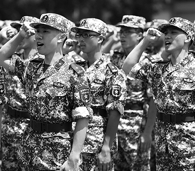 上图 7月16日,身着迷彩服的香港青少年在参加军事夏令营开营典礼。