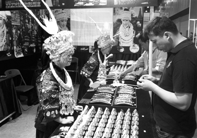 特色手工艺品、食品等土特产仍然是我国旅游商品销售的“主力军”。图为在第四届义乌中国国际旅游商品博览会上,有民族特色的苗银首饰吸引观众驻足。 敖 蓉摄