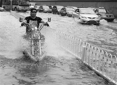 ▷ 7月21日下午,在北京东城区的广渠门桥附近,一辆摩托车从雨后积水的路面驶过。